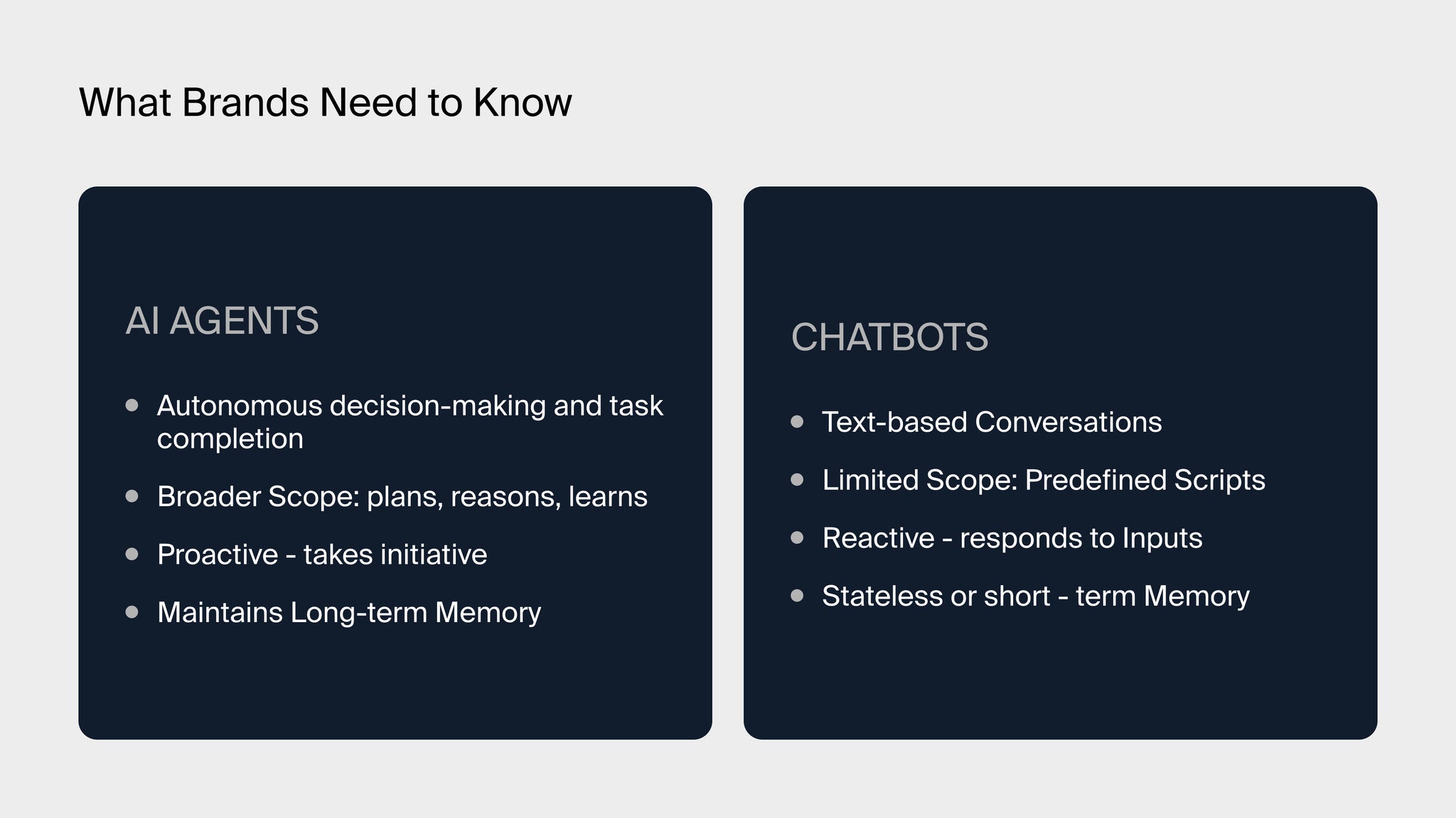AI agents are not a single category. They can be designed with different approaches depending on the role they are meant to play in commerce. Understanding these distinctions helps brands anticipate how agents may influence the customer journey.